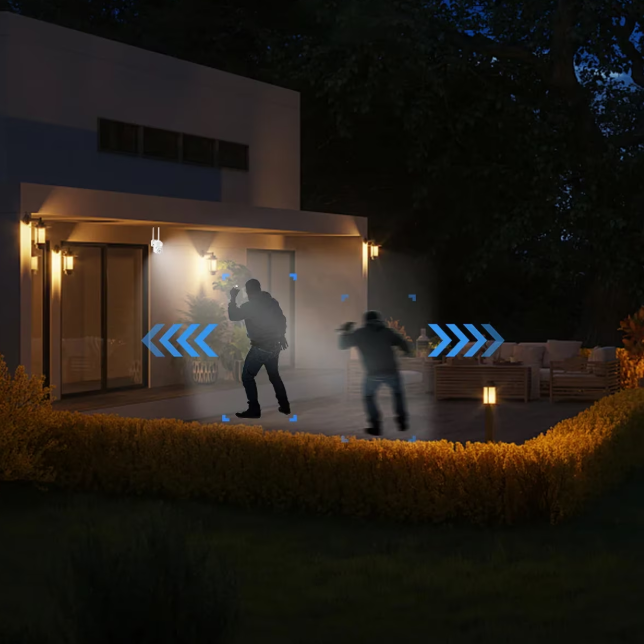 Pe timp de noapte, la detectarea formei umane aflata in miscare se aprind 16 leduri puternice si sunt facute capturi de imagine, color, care sunt trimise imediat pe aplicatie.In momentul detectarii formei umane.