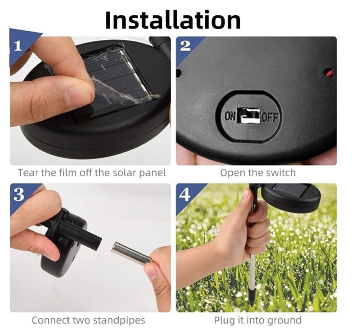 Energia decoratiunii provine de la panoul solar. Lampa poate fi folosita la exterior - protectie IP65, de la minus 20 grade pana la plus 60 grade.