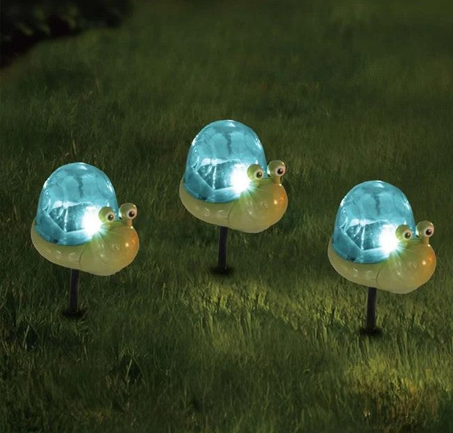Lampa solara mini cu model melc albastru (15x5cm) cu lumina alba rece. Are o baterie reincarcabila de 1.2V 40mAh (nu poate fi inlocuita) si buton Pornit/Oprit.