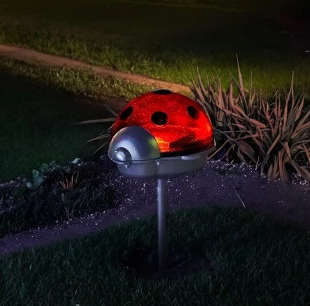 Lampa solara mini cu model buburuza rosie (7.5x4.5cm) cu lumina alba rece. Cu baterie reincarcabila de 1.2V 40mAh (nu se poate schimba) si buton de pornire/oprire.